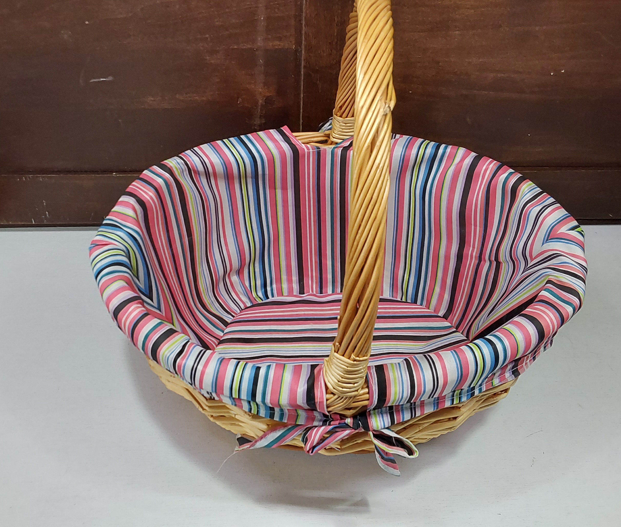 Een rieten mand of picknick mand bekleed met een vrolijke stof.