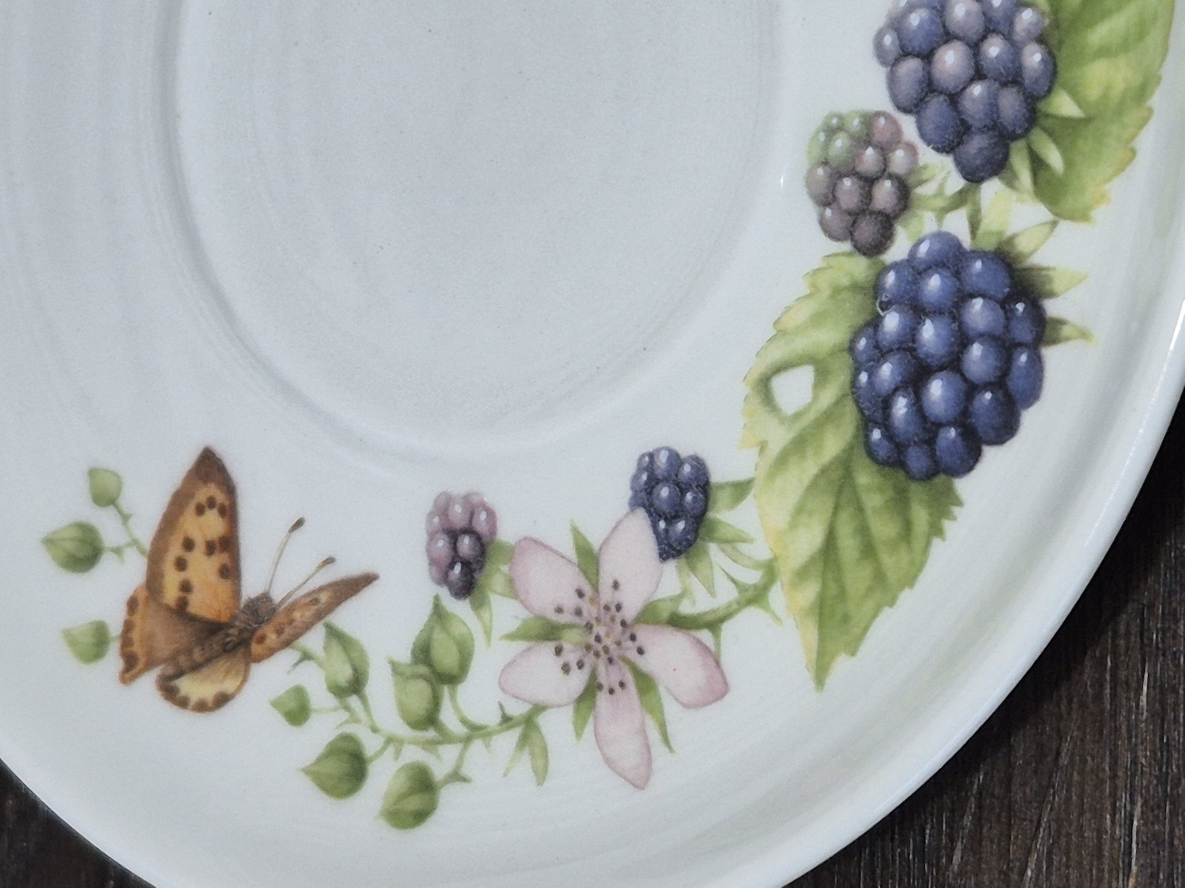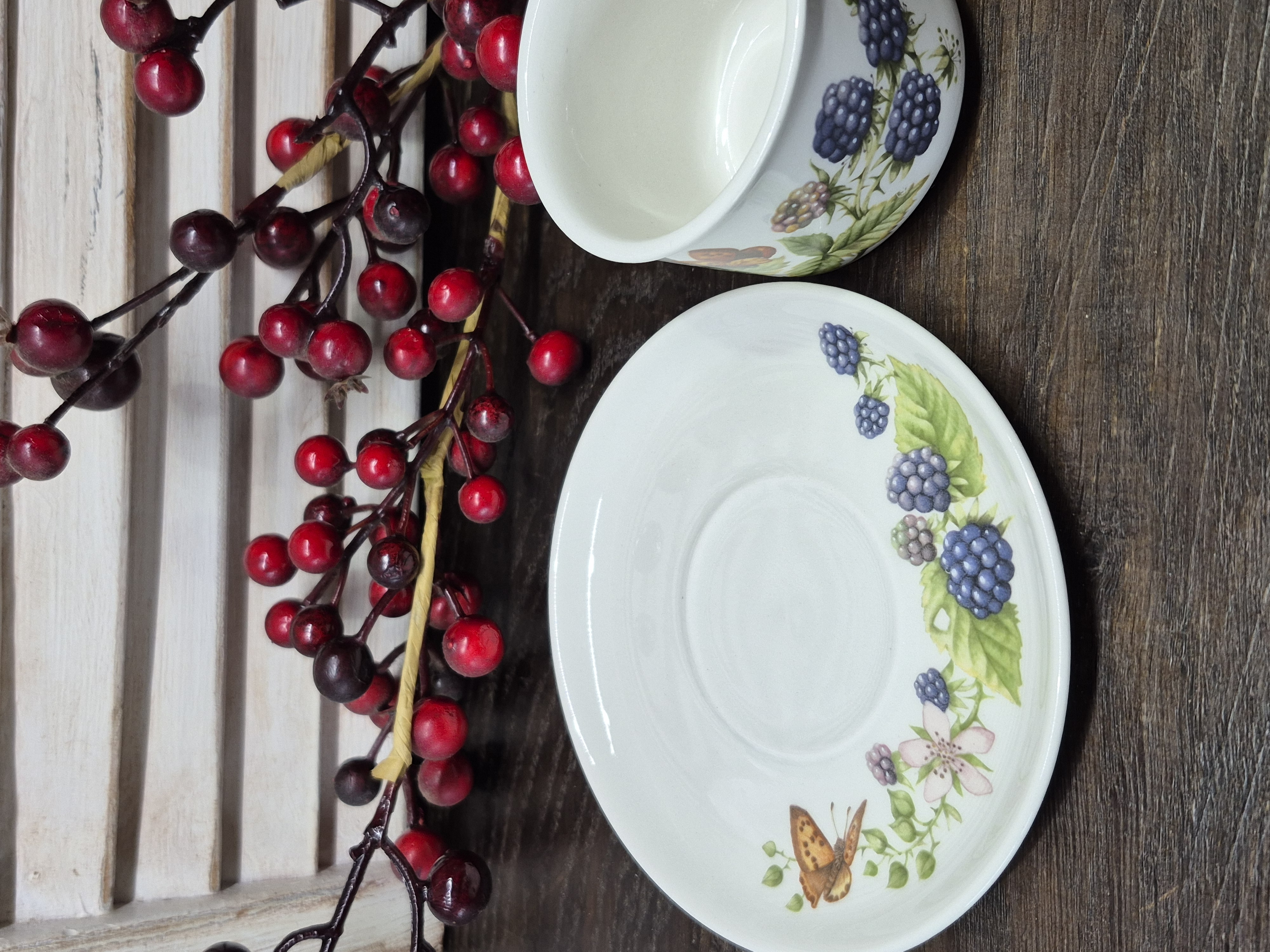 Het servies beeld allerlei wilde vruchten en daarbij een vlinder uit.