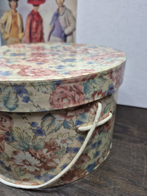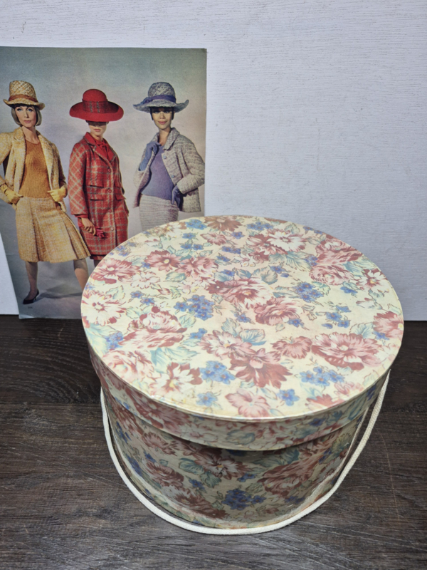 Een mooie vintage kartonnen hoedendoos met een fraai motief.