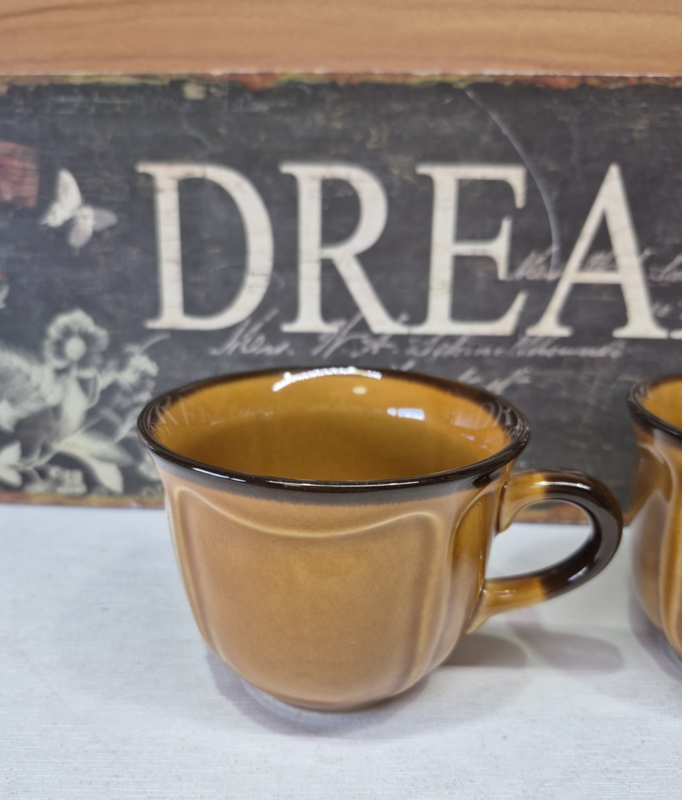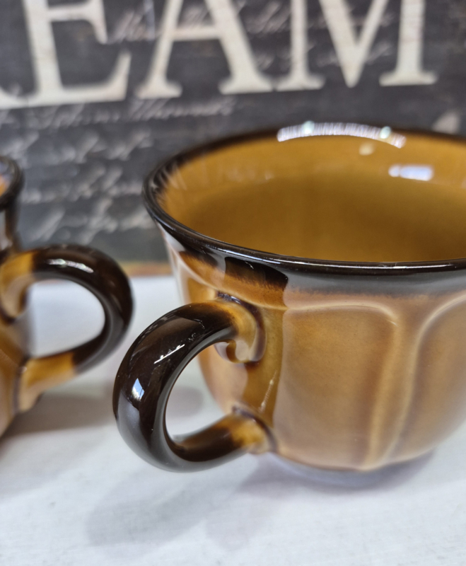 2 grote koppen, mokjes eigenlijk van Pools aardewerk met mooi bruin glazuur.