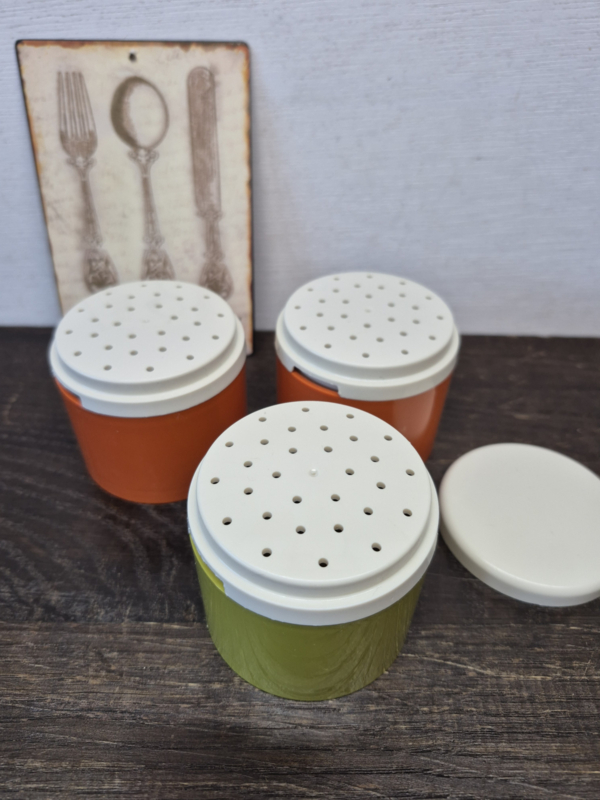 Deze 3 vintage kruidenpotjes van Tupperware hebben elk een strooidekseltje en passen in elkaar..