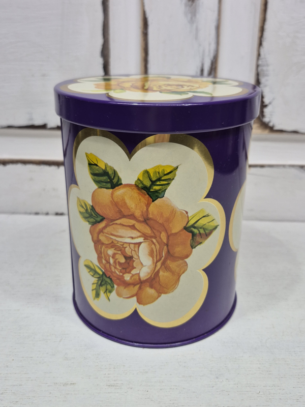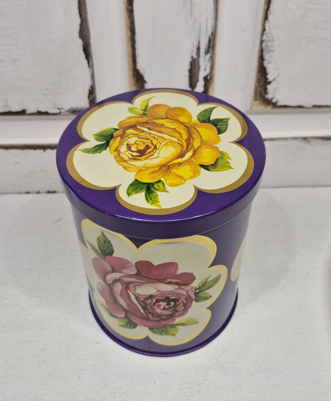 Dit vintage blikje met rozen heeft leuke kleuren, ziet er goed uit voor de leeftijd en is 15 cm, hoog.