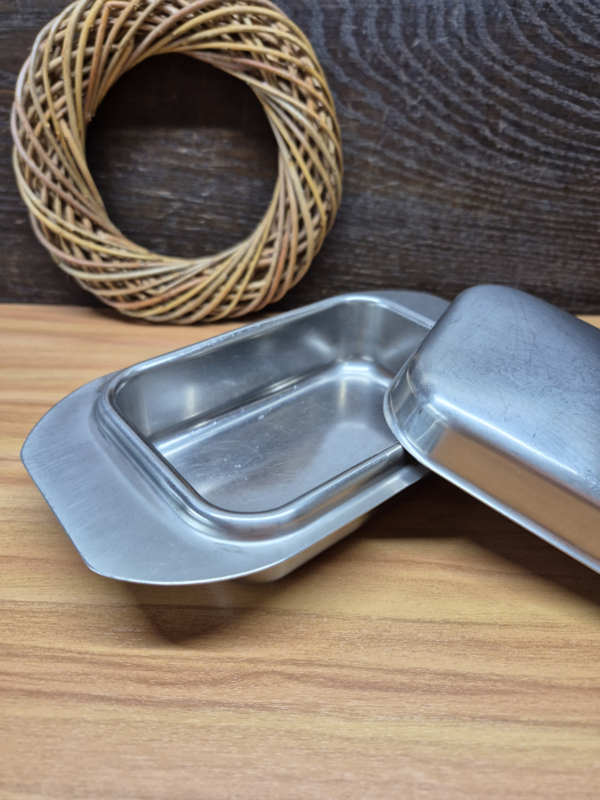 Deze vintage botervloot van RVS mag dan gebruiksporen vertonen maar het kan nog een levenlang mee.