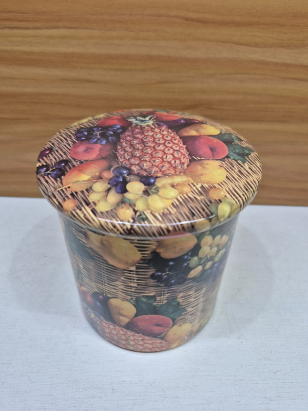 Een jaren 70 blikje met leuke afbeeldingen van riet en fruit.