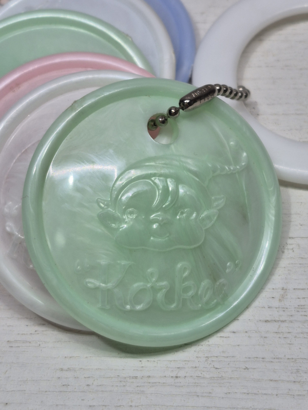 Glanzende plastic schijfjes in lieve babykleurtjes aan een ring..