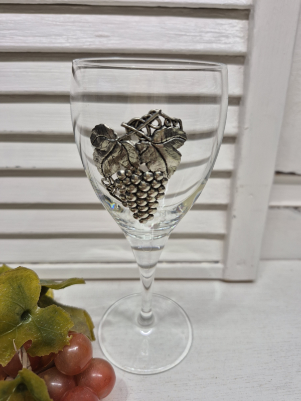 Een wijnglas met tinbeslag in de vorm van een druiventros.