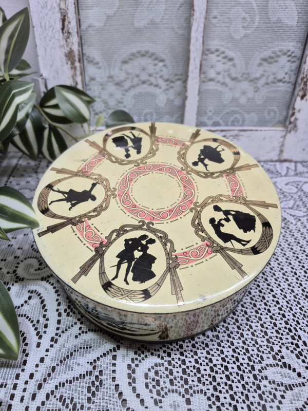 Vaak worden op blikjes silhouet afbeeldingen gebruikt, zo ook op dit Engelse trommeltje..