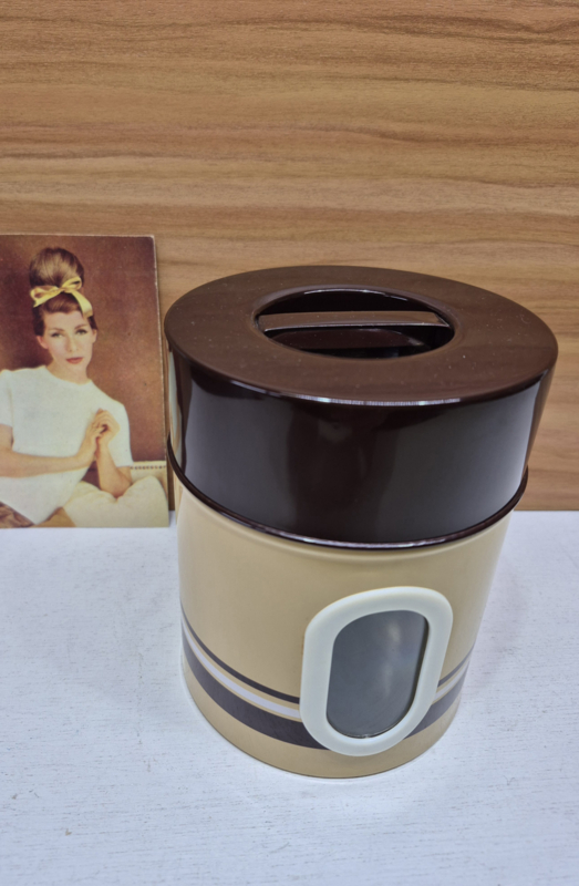 Een vintage blik met een leuke deksel waarin een greepje is verwerkt.