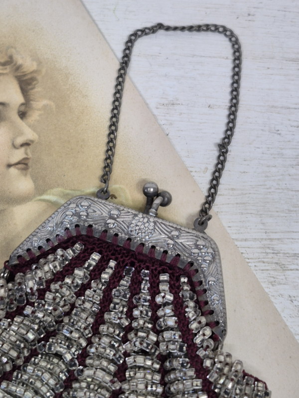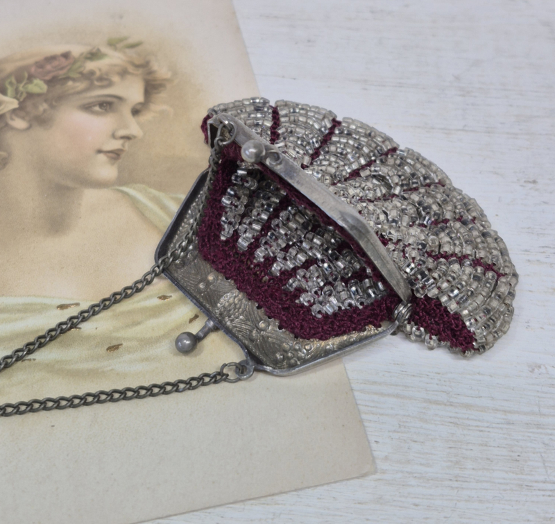 Een klein beursje, kunstig gemaakt met glaskraaltjes.
