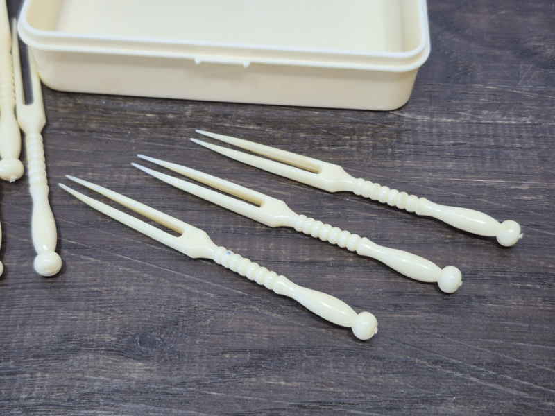 Jaren 60-70 ivoorkleurige kunststof vorkjes het originele bijbehorende doosje.