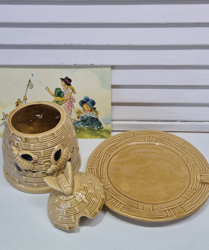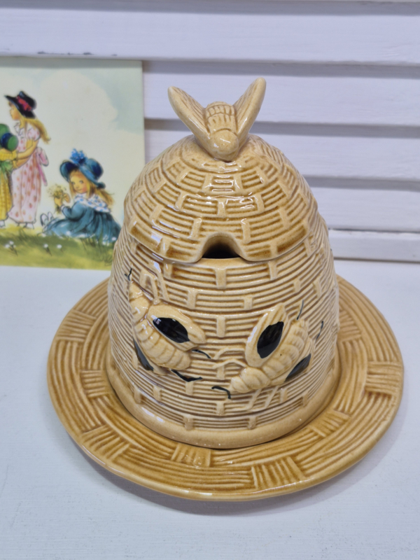 Een potje voor de honing, in de vorm van een bijenkorf compleet met de bijtjes er op.