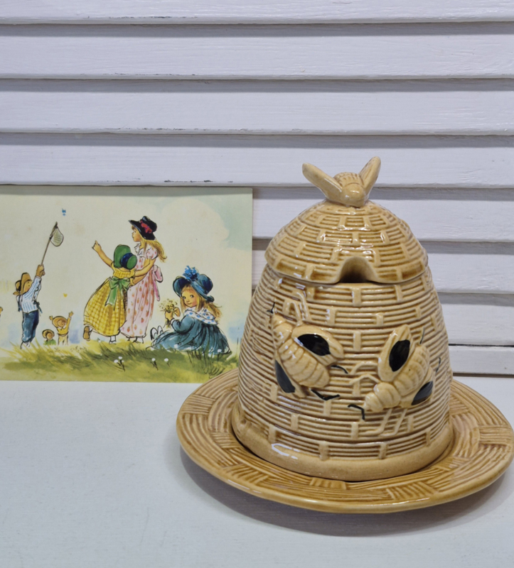 HoningpotjeEen potje voor de honing, in de vorm van een bijenkorf compleet met de bijtjes er op.