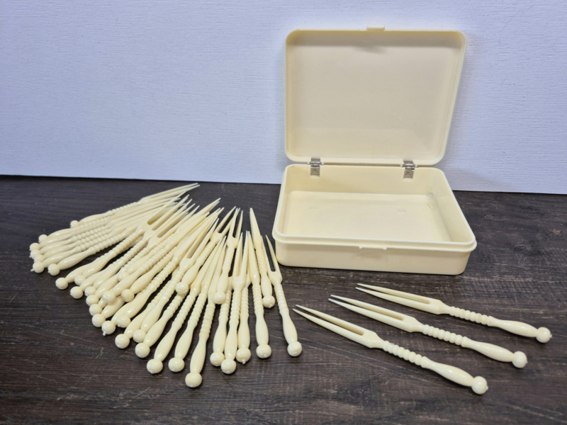 Cocktail of tapas vorkjesJaren 60-70 ivoorkleurige kunststof vorkjes het originele bijbehorende doosje.