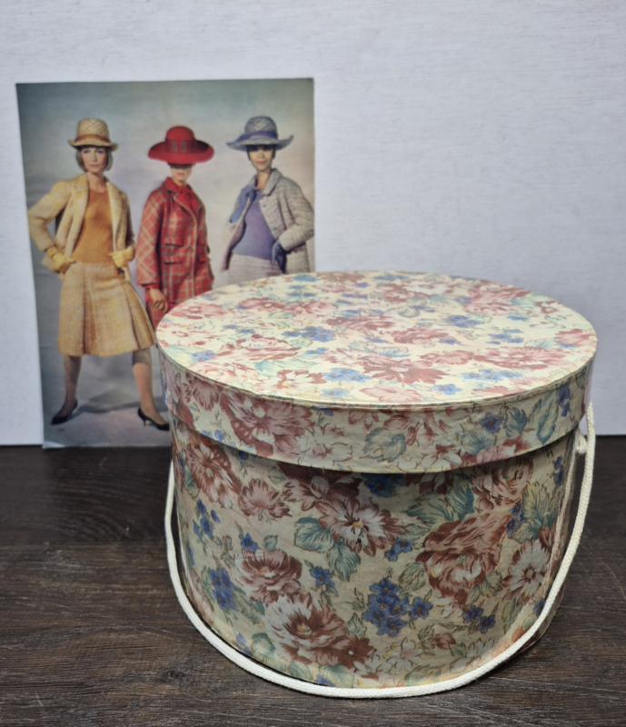 Een mooie vintage kartonnen hoedendoos met een fraai motief.