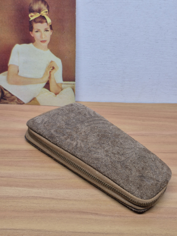 Een suède etui met een manicureset van vroeger..