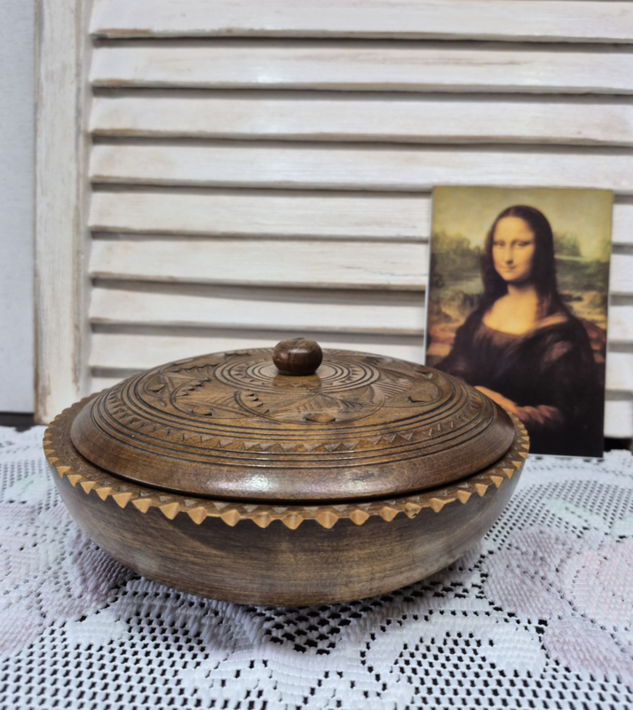 Een schaaltje met deksel, versiert met Fries houtsnijwerk.