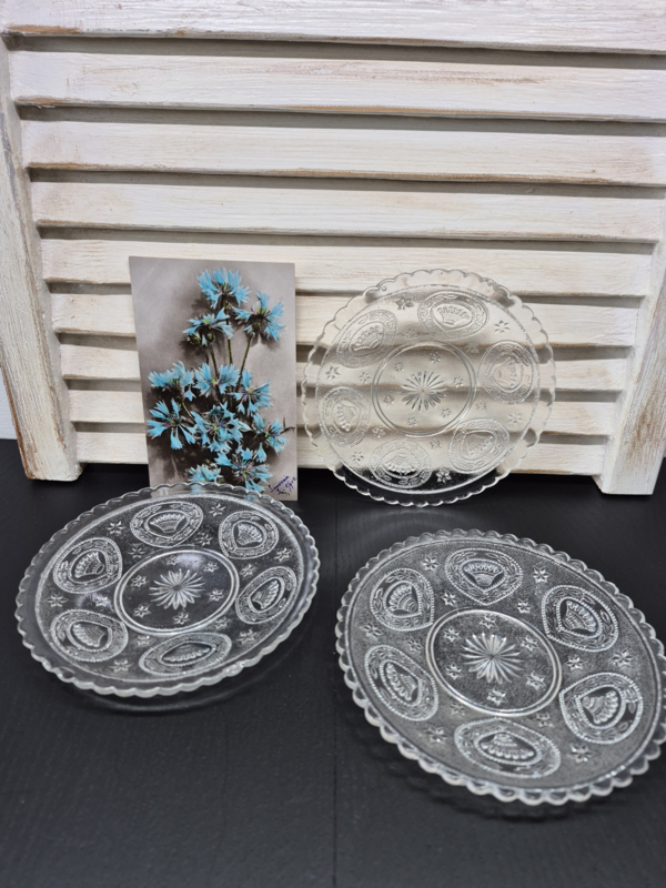 Ze zijn 16 cm in doorsnee.€ 6.50 - 3 antieke glazen gebaksbordjes