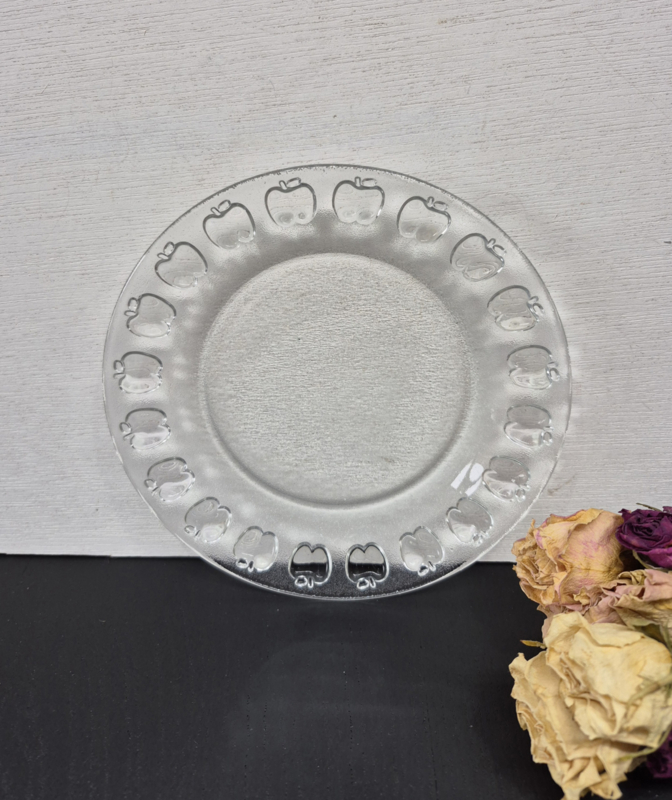 Glazen gebaksbordje met appeltjesOp de rand van dit glazen gebaksbordje vind je een gezellige appeltjes decoratie.